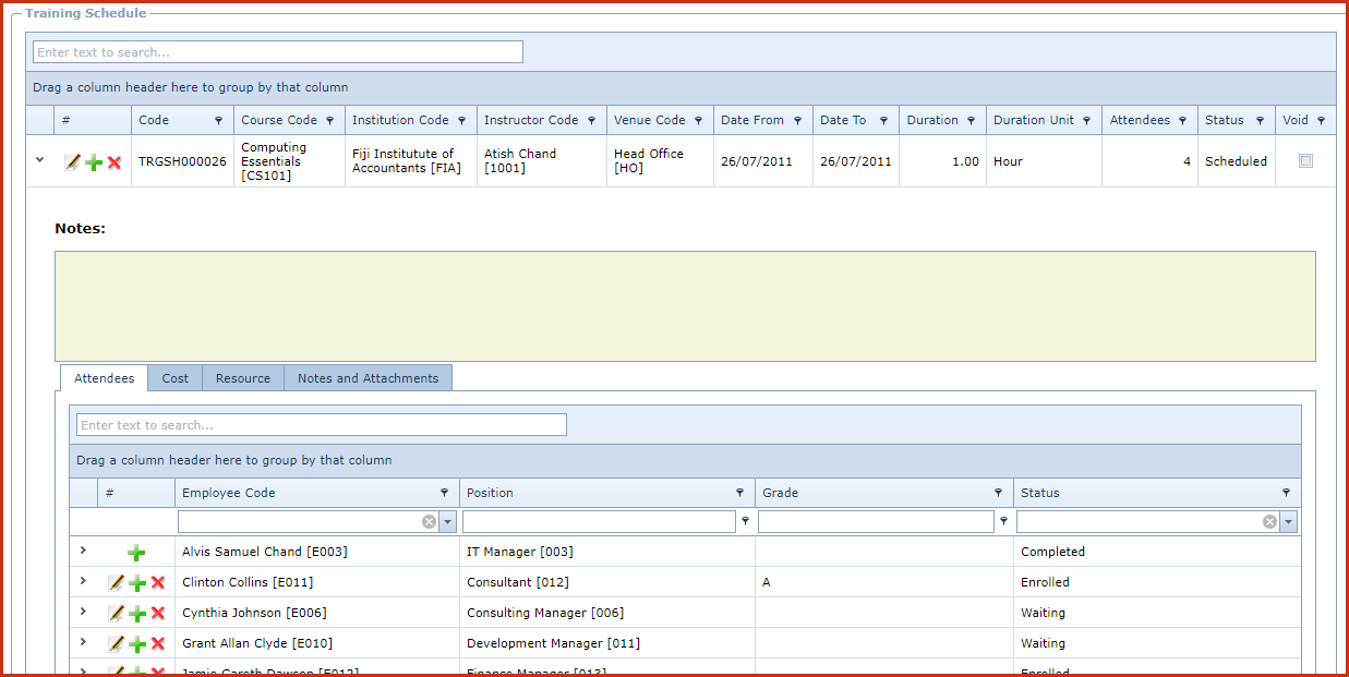 Training Schedule Listing