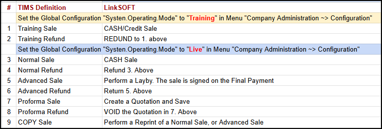 Below are the definitions of TIMS transactions types, including: Training Sale, Normal Sale, Advanced Sale, Proforma, Copy and Returns.