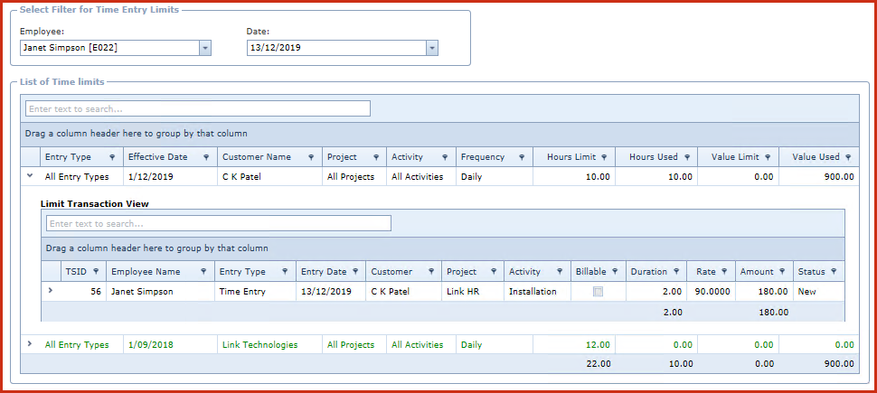 Link Technologies - LinkSOFT Documentation Time Entry Limits shows a list of time entries that have been created for a project with activity limits.