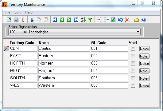 3. Enter appropriate Territory GL code in Territory Maintenance Screen (212). Leave GL code blank if Territory code is not one of the segments GL