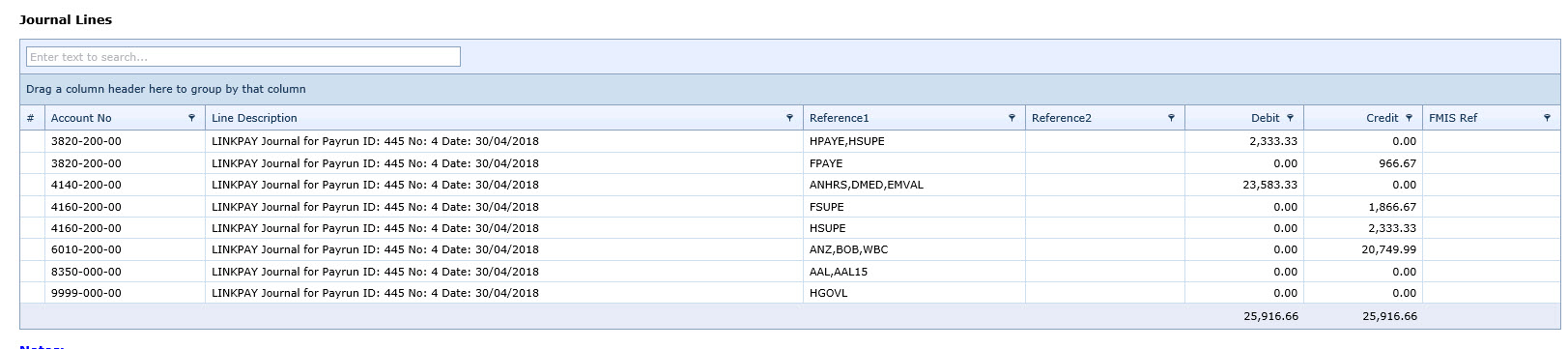 - For example code "3820-200-00" has a Dr total of 2338.33 on the report which comprises "HPAYE" and "HSUPE". Under "Journal Lines" the Dr entry for "3820-200-00" is only 2333.33 (HSUPE), however, the reference reads "HPAYE" and "HSUPE".