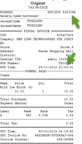 ---Important Note - This change was implemented by FRCS after the POS was certified. This is, therefore, a CHANGE REQUEST - Not a system issue --- Hi Sanjay, - We processed a sale at 8.24am on the 30/01/2019 but the "POS Time" on "Fiscal Invoice" read 29/01/2019 20:24. Refer to the attached receipt.