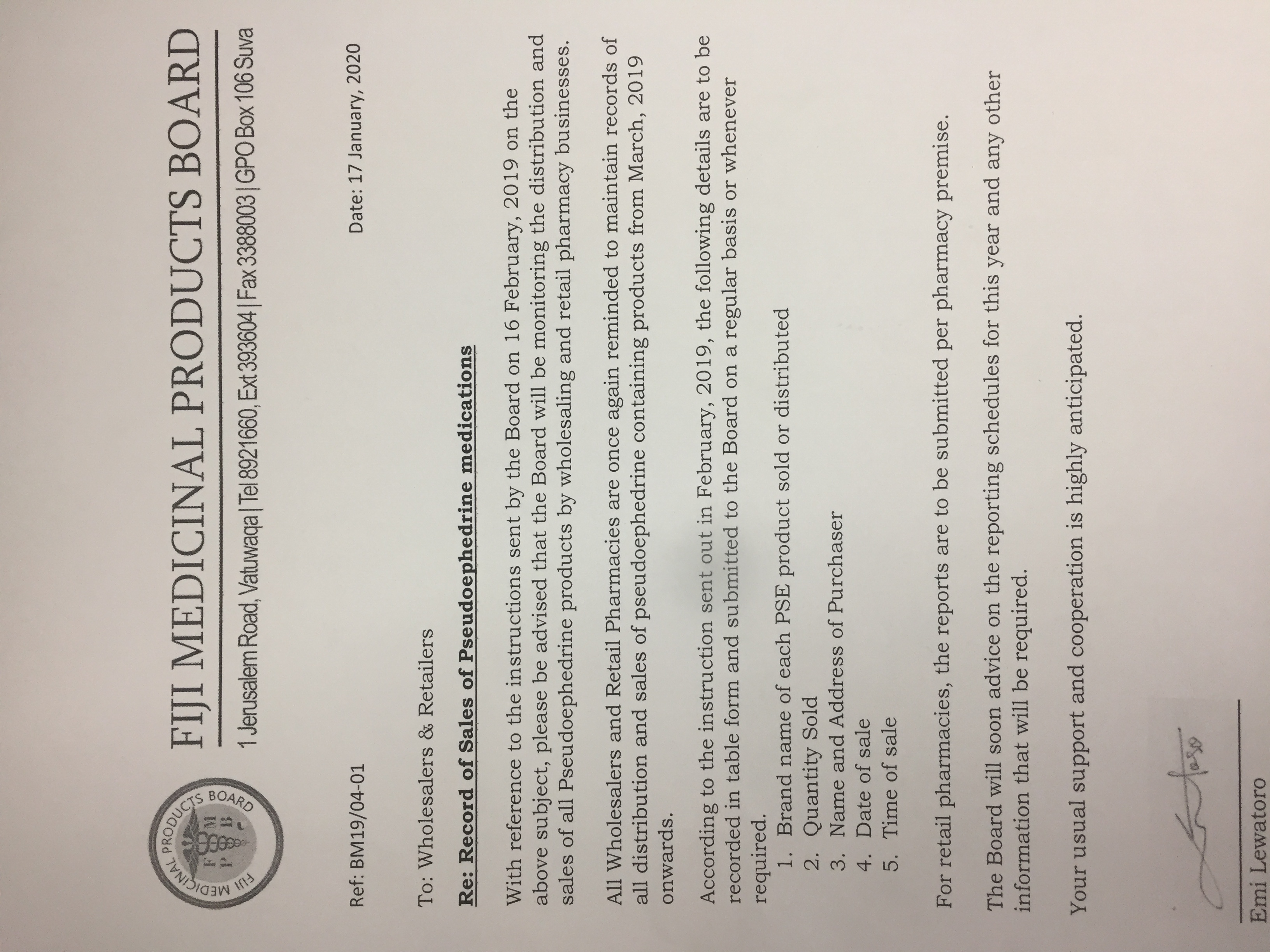 According to the "Fiji Medical Products Board" pharmacies must submit records of "Pseudoephedrine" medications sold by the entity. Following details needs to be submitted: - Brand Name of each PSE product sold or distributed