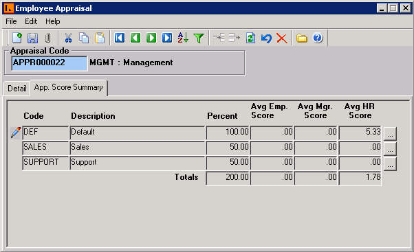 Maintain Employee App. Score Summary tab contains the following types of information: