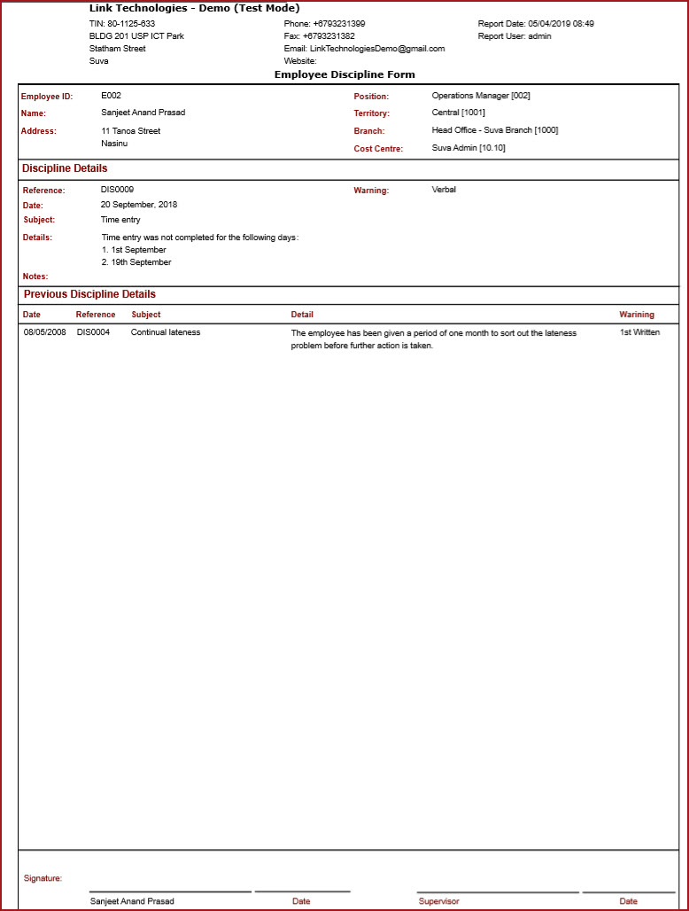 Employee Discipline Form shows "Current" and "Previous" disciplinary records for an employee from Link HR. This form can be printed and signed by the "Employee" and "Supervisor".