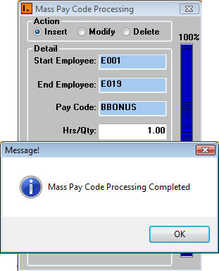10.  When Mass Pay Code processing is completed successfully, it will load the following message. Select 'OK'.