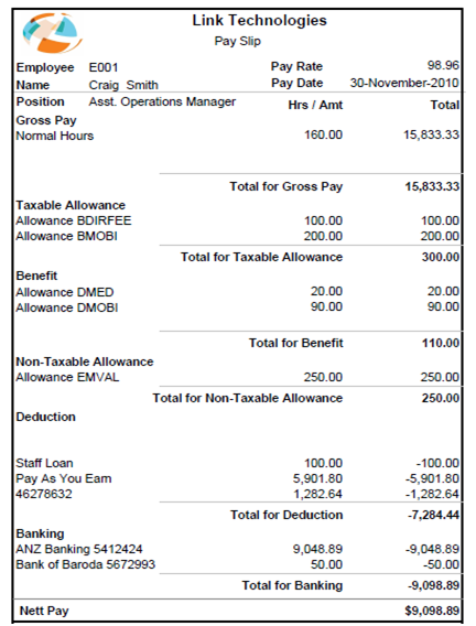 Employees use their Pay Slips to check that the details of their Pay are correct. Use this report to print off Pay Slips for employees in your organization. You can customize Pay Slips to your company's requirements. LinkPAY has the following pay slips format the user can use and select to print from: