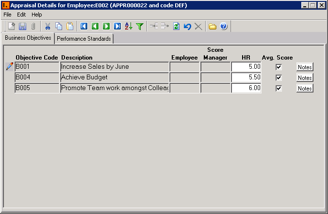 An Employee Appraisal needs to measure an employee's effectiveness in performing the stated business objectives of an organisation. This tab page displays the Business Objectives and the scores that you have assigned them. These Business Objectives come from the Appraisal Type.